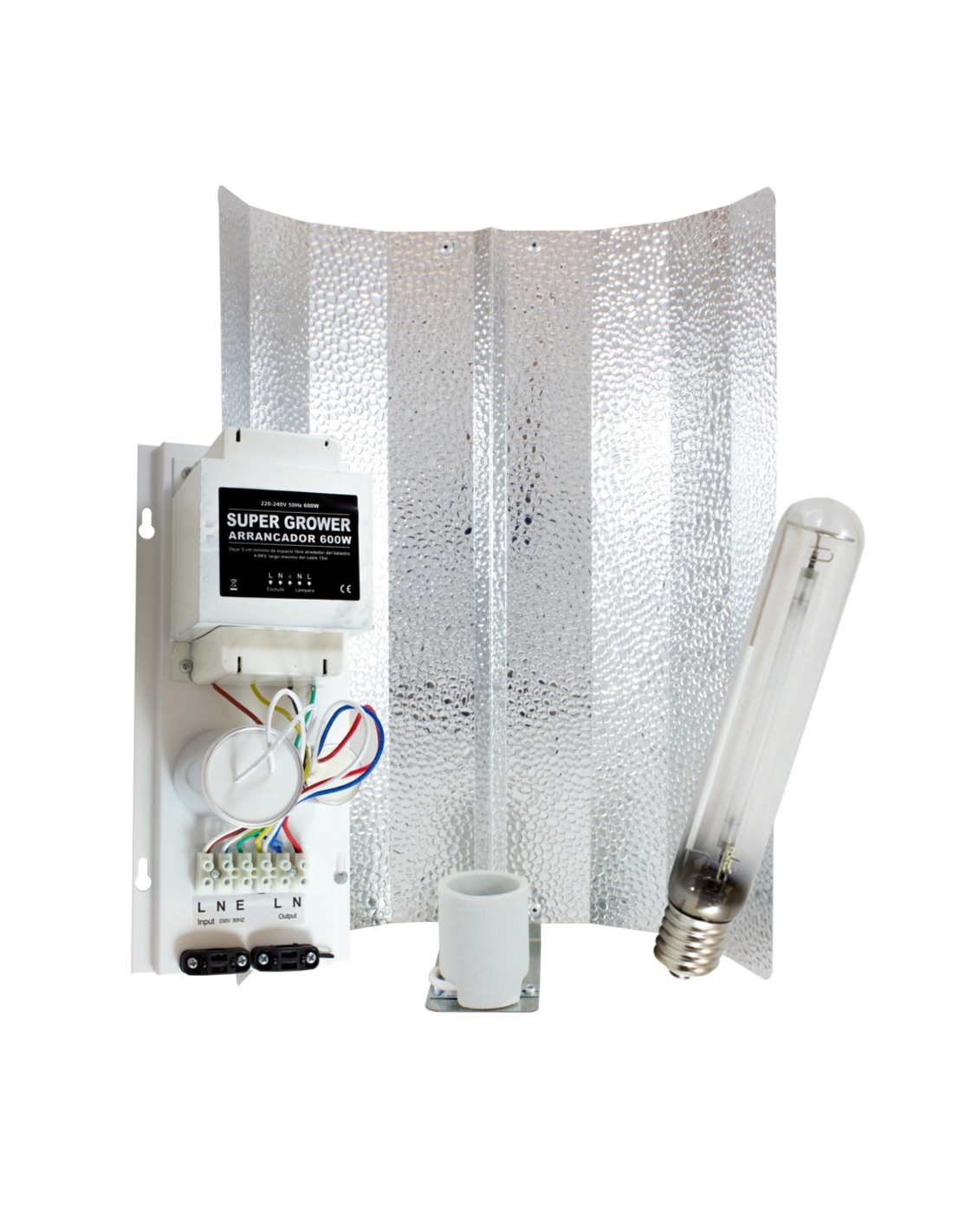 Pantalla Super Reflector + casquillo E-40: La pantalla super reflector está diseñada para optimizar la distribución de la luz, aprovechando al máximo cada vatio de energía. Con una textura tipo granulado y un nivel superior de reflexión, esta pantalla asegura una dispersión uniforme de la luz sobre tus plantas, promoviendo un crecimiento saludable y vigoroso.